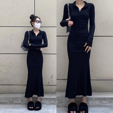 春秋季2024新款法式艺术生通勤穿搭感小个子长袖黑色连衣裙女