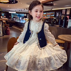 女童春装连衣裙套装新款洋气牛仔马甲蕾丝裙两件套春秋小女孩套裙
