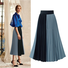 2025春秋高腰拼色百褶裙女大码中长款压褶显瘦a字裙时尚半身裙子