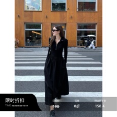 辰米范 黑色修身长袖连衣裙针织裙女秋季新款显瘦大摆裙V领收腰裙