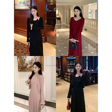 【270克棉磨毛】2025秋修身长款连衣裙女收腰显瘦V领气质针织裙