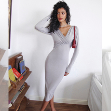 交叉V领性感连衣裙收腰修身显瘦秋冬褶皱加绒打底紧身包臀裙子女