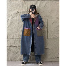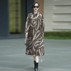 秋季新款复古拼色连帽单排扣风衣女宽松显瘦豹纹印花长款外套女