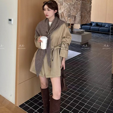 35758欧洲站25秋时尚立领拼格子中长款系腰带显瘦风衣外套配包包