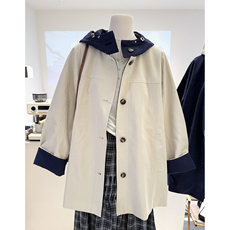 拼接撞色连帽单排扣风衣女秋季新款宽松显瘦韩版外套中长款上衣潮