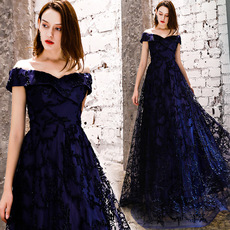 一字肩长款鱼尾亮片晚礼服女气质女神范显瘦宴会晚装主持人连衣裙