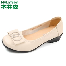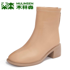 木林森头层牛皮女鞋冬季新款靴子百搭圆头粗跟真皮软皮时装短筒靴