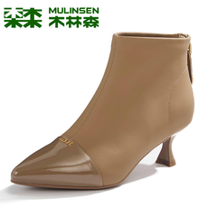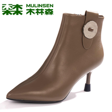 木林森女鞋冬季高档羊皮后拉链马丁靴尖头细跟高跟真皮气质时装靴