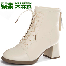 木林森女鞋冬季真皮后拉链高帮短靴牛皮粗跟时尚休闲英伦马丁靴子