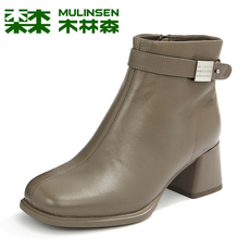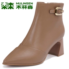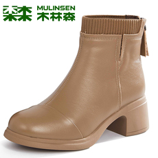 木林森女鞋2023冬季新款真皮时尚粗跟单靴加绒短靴短筒时装矮靴女