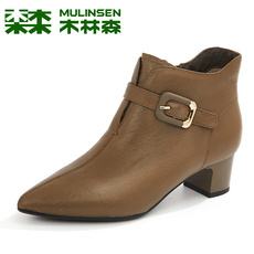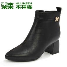 木林森女靴冬季羊皮尖头方跟优雅高档皮靴英伦粗跟时尚侧拉链短靴