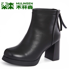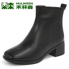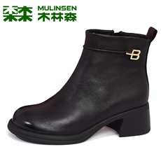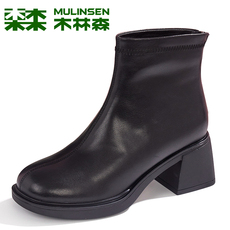 侵权下架 木林森女靴冬季羊皮高跟粗跟优雅马丁靴女士简约真皮
