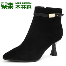 木林森女鞋冬季羊反绒气质高跟尖头马丁靴细跟英伦风高档时装短靴