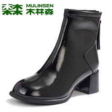 木林森女靴冬季真皮加绒保暖漆皮马丁靴粗跟女士时尚百搭高档矮靴