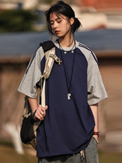 Nobodyknows夏季基础插肩袖条纹拼色宽松情侣百搭纯棉圆领短袖T恤