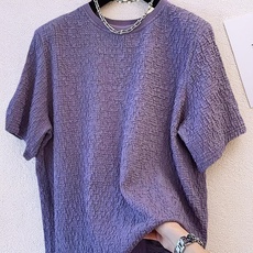 冰丝短袖男港风ins潮牌褶皱条纹T恤宽松圆领垂感五分袖慵懒风上衣
