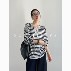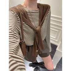 徐大脸吖定制 法式条纹T恤罩衫秋设计感鱼骨绑带宽松长袖针织衫女