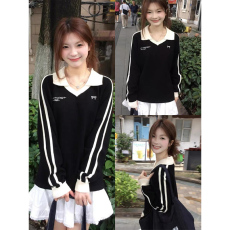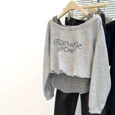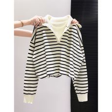 2025韩系条纹假两件针织拼接衬衫女设计感小众宽松显瘦长袖上衣