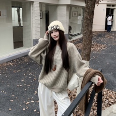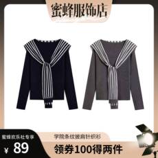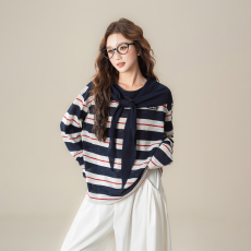 GAORAN宽松系带条纹长袖毛针织衫女秋季新款韩版气质百搭通勤毛衣