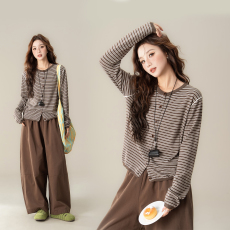 2024秋冬新款休闲风复古条纹遮肉显瘦宽松V领长袖中长款T恤雪尼尔