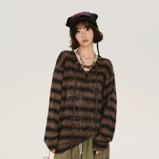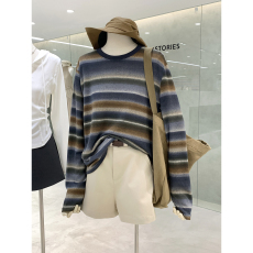 复古慵懒风渐变条纹长袖针织衫2025早秋新款宽松舒适小众百搭上衣