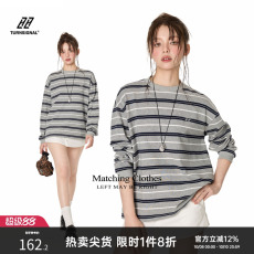 3MER哦哦三妹韩系慵懒圆领条纹长袖卫衣女秋美式复古宽松休闲上衣