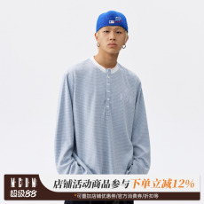 【侯明昊同款】MEDM字母刺绣亨利领条纹长袖T恤秋季宽松男女上衣t