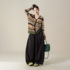 彩色V领条纹针织开衫女早秋新款韩系宽松慵懒风显瘦减龄长袖上衣