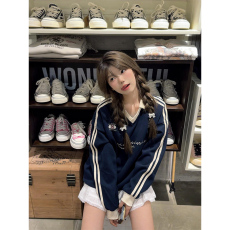 美式POLO领撞色条纹卫衣女春秋季2024新款韩系宽松设计感长袖上衣