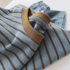 pusumede 撞色条纹磨毛针织t恤女宽松打底衫复古慵懒休闲长袖上衣