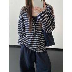 2025春夏新款减龄纯棉简约宽松经典海军蓝白条纹OLTD穿搭长袖T恤