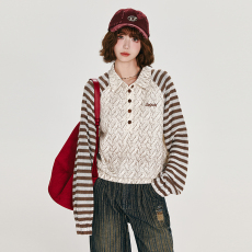 pusumede 复古条纹长袖t恤女翻领设计感小众宽松休闲慵懒针织上衣