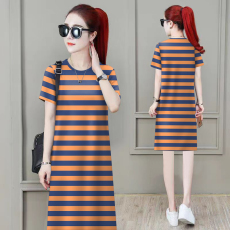 好品捡漏~新款女装夏季圆领短袖长裙条纹宽松遮肚减龄长款连衣裙