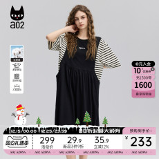 a02条纹短袖拼接假两件T恤裙设计感连衣裙女2025新款夏季长裙