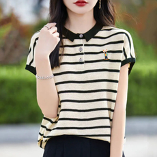 条纹针织衫女圆领短袖T恤休闲薄上衣夏季新款气质大码宽松t恤上衣