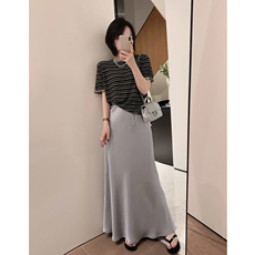 麻霖桑蚕丝莱赛尔混纺丝滑垂坠圆领短袖条纹休闲针织上衣