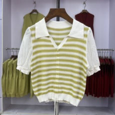 LANCY/悦朗姿夏季V领条纹撞色短袖针织衫女翻领修身上衣