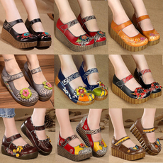 民族风刺绣花朵女鞋真皮绣花鞋镂空坡跟鞋春秋单鞋厚底松糕鞋