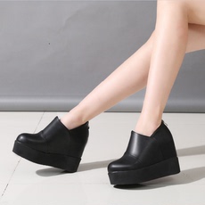 防水台内增高皮鞋女春秋新款个性厚底松糕坡跟深口鞋小码舒适单鞋