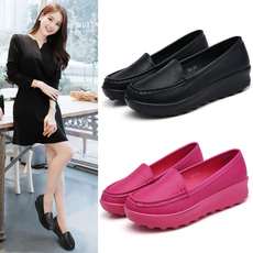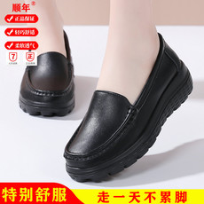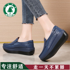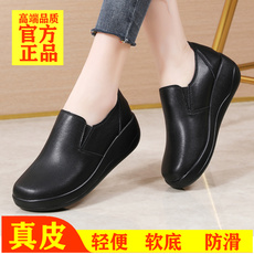 真皮女单鞋坡跟厚底一脚蹬松糕女鞋工作鞋黑色妈妈软底舒适春秋款