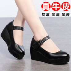 厚底真皮单鞋2025春新款牛皮坡跟真皮工作单鞋松糕底低帮女鞋皮鞋