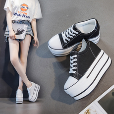 2025春秋韩版小白鞋坡跟松糕厚底单鞋透气帆布舒适单鞋内增高女鞋