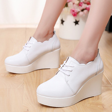 真皮厚底松糕鞋女春14CM内增高女鞋小白鞋坡跟百搭休闲超高跟单鞋