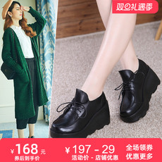 1239系带单鞋春秋新款坡跟厚底软底休闲女深口圆头松糕皮鞋妈妈鞋