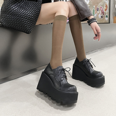 厚底松糕鞋内增高女鞋春秋季新款百搭皮面单鞋坡跟超高跟黑色显瘦