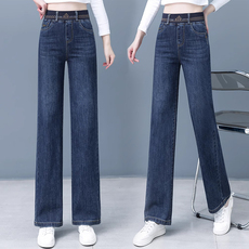 阔腿新款窄版松紧高腰牛仔裤女士春秋季弹力宽松显瘦直筒妈妈长裤