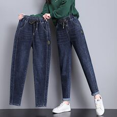 秋冬大码200斤加绒加厚牛仔裤胖MM宽松显瘦松紧高腰哈伦老爹裤潮
