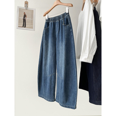 2026春秋新款高腰简约休闲阔腿长裤女特大码松紧腰复古直筒牛仔裤