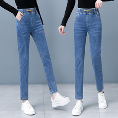 秋季新款大码牛仔裤女胖MM妈妈裤子宽松显瘦高腰松紧腰弹力哈伦裤