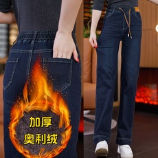 冬天新款加绒加厚松紧腰阔腿牛仔裤女妈妈高腰九分保暖直筒棉裤子
